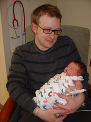 Well, the moments we did spend with Oliver were awesome. And he got to see all four of his proud grandparents, his great-aunt Kay and his Aunt Carrie and her boyfriend, Eli. Sarah and I received great support, with dozens and dozens of phone calls, text messages, e-mails and comments on this Web site. We also had nice gifts delivered to our room from our friends Mike and Jennifer, and a cool “diaper wreath” from my colleagues at Standing Partnership. And some work associates who happened to be on-site at the hospital today made a special, and unexpected, visit to my room this afternoon.