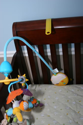 Turns out my instinct was correct. You see, Sarah was trying to calm Oliver this morning in his crib. She had his mobile going. It’s the Symphony in Motion model by the company Tiny Love. This model wasn’t our first choice, but we didn’t have many options due to the sleigh-style crib we purchased (with the help of our mothers, I might add). The attachments on most of the popular mobile models wouldn’t fit over the wood slats on our crib. So we checked around, read reviews and settled on the Symphony in Motion model.